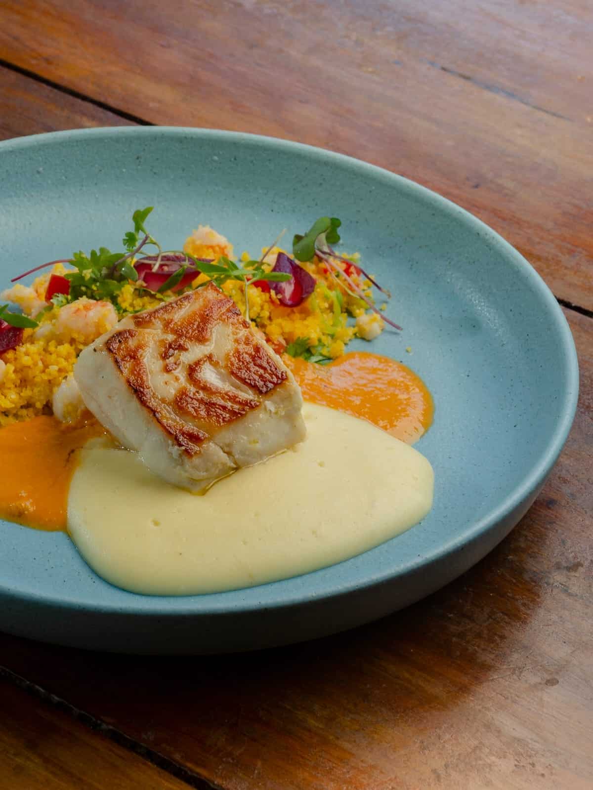Prato: Pescada gratinada com fios de legumes, aromatizados com pimenta de cheiro