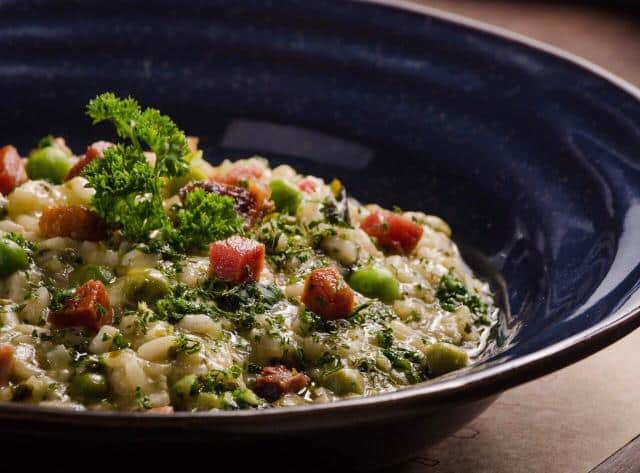 Risoto de ervilhas frescas, manjericão e bacon (opção vegetariana sem bacon)